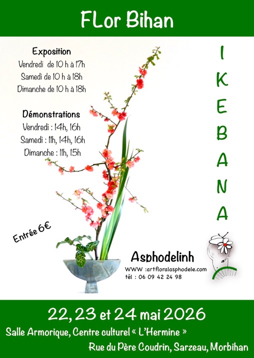 L’association Asphodelinh ikebana organise les 22, 23, et 24 mai une exposition et démonstration d’ikebana, art traditionnel floral japonais, à la salle Armorique au centre culturel de l’Hermine de Sarzeau. L’exposition se déroulera : le vendredi 22 mai de 10 h à 17 h, le samedi 23 mai, de 10 h à 18 h, et le dimanche 24 mai, de 10 h à 18 h. Les démonstrations se feront le vendredi 22 mai, de 14 h à 16 h, le samedi 23 mai, de 11 h à 14 h, et le dimanche 24 mai de 11 h à 15 h.
